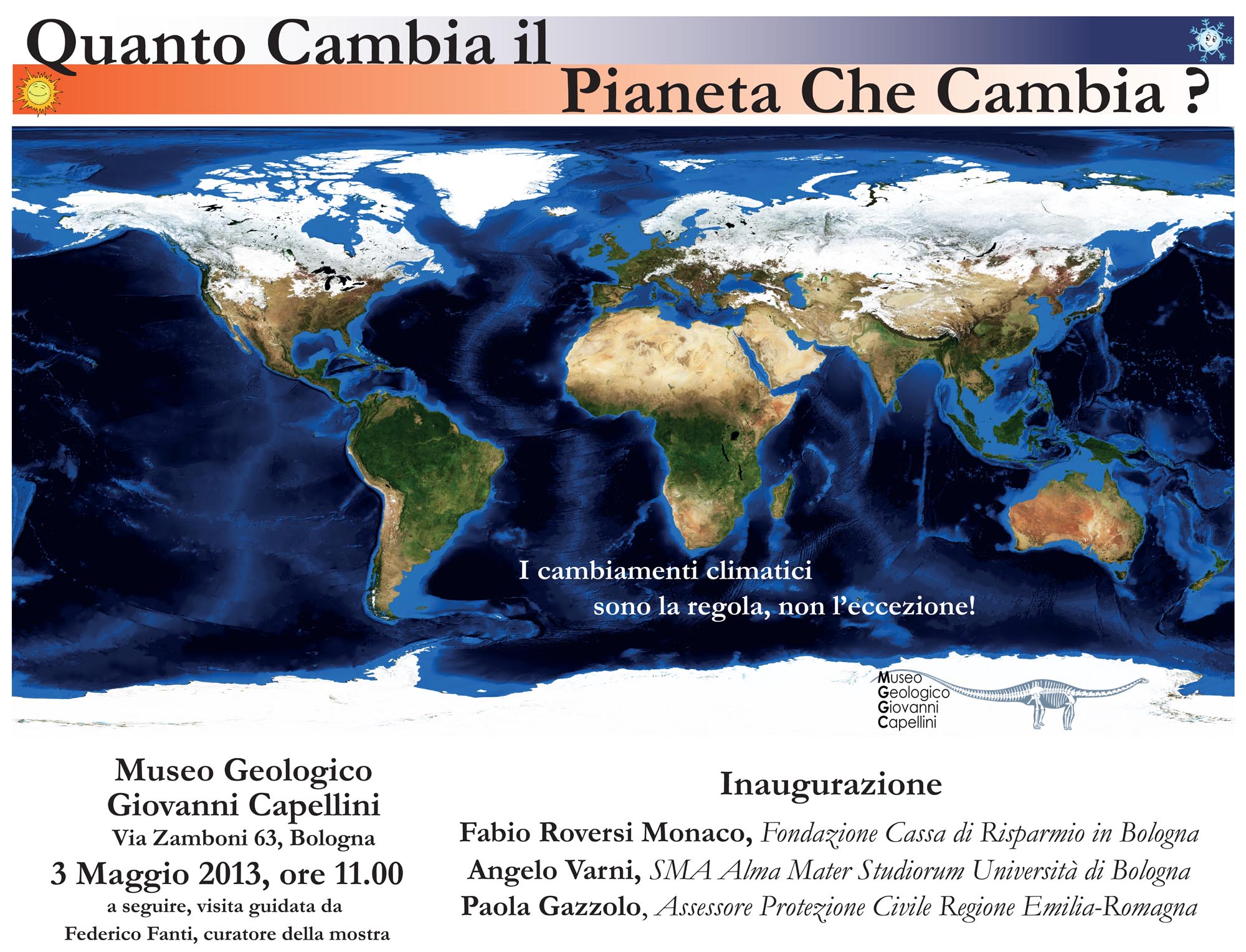 Quando il pianeta era più caldo di oggi? Quando più freddo? E quanto? Come era l'Italia negli ultimi due periodi più caldo e più freddo? Come cambiano i nostri fiumi? Come cambiano nei decenni i nostri calanchi? Una risposta a queste domande arriva grazie alla mostra "Quanto cambia il pianeta che cambia?", che apre venerdì 3 maggio al Museo Geologico "Giovanni Capellini". L'inaugurazione è in programma alle 11, con gli interventi di Angelo Varni (Sistema Museale di Ateneo), Fabio Roversi Monaco (Fondazione Carisbo) e Paola Gazzolo (Regione Emilia-Romagna). Seguirà una visita guidata della mostra condotta dal curatore Federico Fanti.