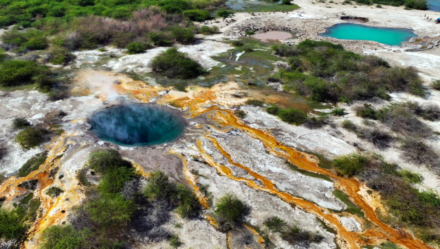 As soon as the car door opens, a wave of hot air engulfs everything. Under a blazing sun and a vast blue sky, the landscape looks like something out of an old science fiction movie. Dozens of pools of boiling water shimmer under a greenish film. Long, yellow, foamy streaks stretch across the ground. Sudden jets of steam rise from the soil, while in the distance sharp rocks glow red and orange. It feels like landing on an alien world. — and that is precisely the point.