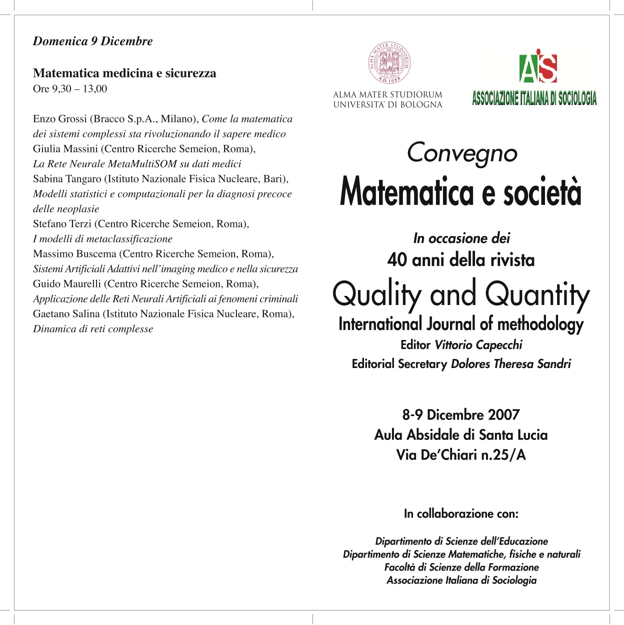 Compie quarant'anni la rivista Quality and Quantity. International Journal of Methodology,  fondata e diretta dal prof. Vittorio Capecchi. Per festeggiare l'importante traguardo, i dipartimenti di Matematica e di Scienze dell'Educazione dell'Università di Bologna promuovono un convegno di due giorni dal titolo "Matematica e Società". L'evento sarà ospitato all'interno dell'Aula Absidale di Santa Lucia (Via de' Chiari, 23) nei giorni sabato 8 e domenica 9 dicembre. Quattro saranno i temi trattati nel loro rapporto con la matematica: sociologia, problemi sociali e culturali, medicina e arti figurative. La rivista Quality and Quantity, il cui primo numero è uscito nel gennaio 1967, è stata per i suoi primi anni di vita stampata in Italia, per poi passare in seguito in Olanda. Attualmente esce, sia in versione stampata che online, a periodicità bimestrale. Il ruolo di Direttore Associato è coperto da Raymond Boudon e Massimo Buscema.