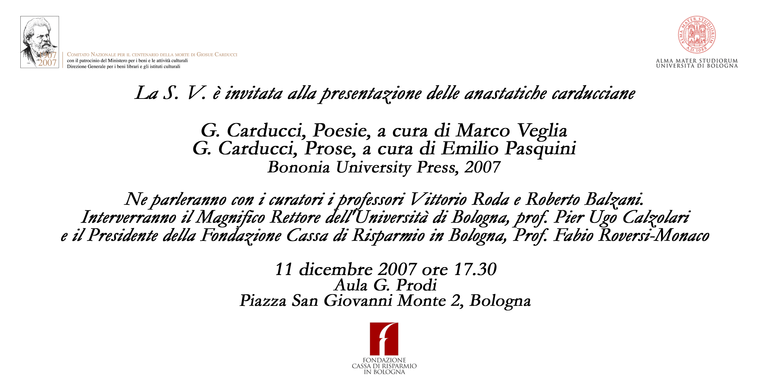 "Poesie" e "Prose" di Giosuè Carducci. Le celebrazioni per il centenario della morte del grande poeta e scrittore, a lungo docente dell'Università di Bologna, non potevano che concludersi con il recupero concreto e fedele delle sue opere. Così, martedì 11 dicembre, alle ore 17,30, l'Aula Prodi del Plesso di San Giovanni in Monte (Piazza San Giovanni in Monte, 2) ospiterà la presentazione delle anastatiche carducciane, edite da Bononia University Press: G. Carducci, "Poesie", a cura di Marco Veglia e G. Carducci, "Prose", a cura di Emilio Pasquini. Assieme ai due curatori, parteciperanno alla presentazione anche i professori Vittorio Roda e Roberto Balzani. Interverranno inoltre il Magnifico Rettore dell'Università di Bologna, prof. Pier Ugo Calzolari e il Presidente della Fondazione Cassa di Risparmio in Bologna, prof. Fabio Roversi Monaco.
