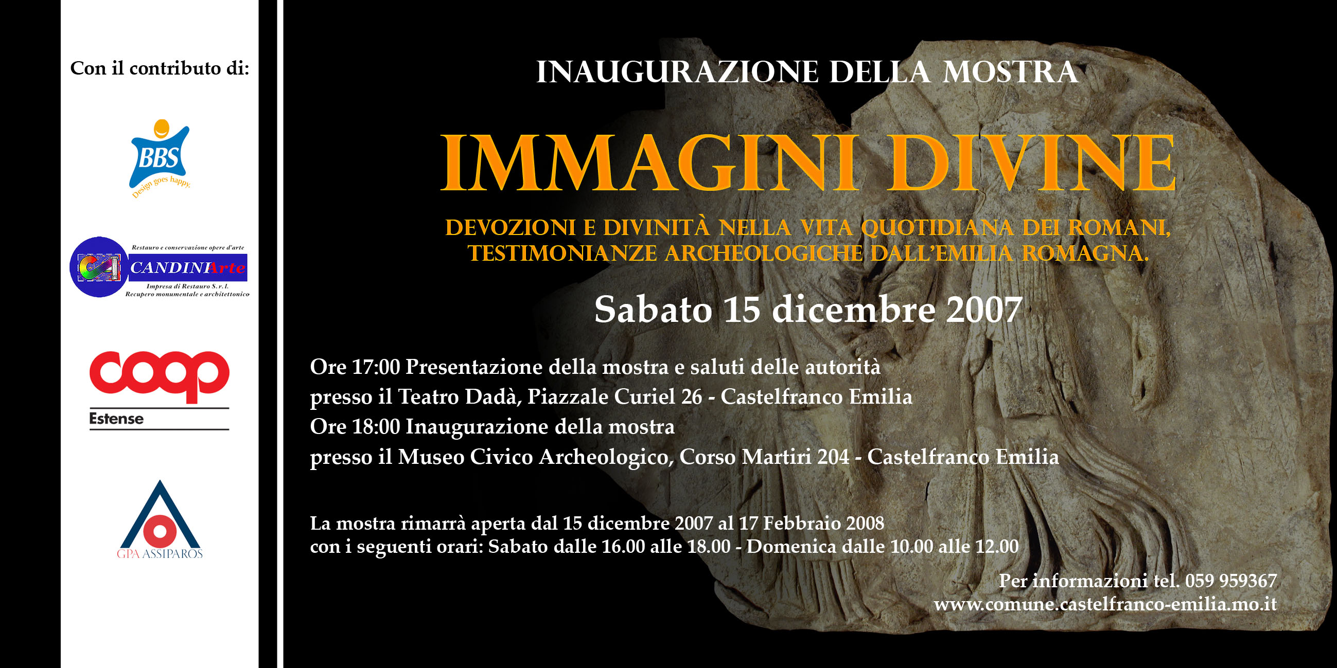 Sarà inaugurata sabato 15 dicembre, alle ore 18, presso il Museo Civico Archeologico di Castelfranco Emilia (Corso Martiri n. 204, Castelfranco Emilia - BO), la mostra "Immagini Divine. Devozioni e divinità nella vita quotidiana dei romani, testimonianze archeologiche dall'Emilia Romagna". L'inaugurazione sarà preceduta, alle ore 17, da una presentazione della mostra che sarà ospitata all'interno del Teatro Dadà (Piazzale Curiel n. 26, Castelfranco Emilia - BO). La mostra, organizzata dal Museo Civico Archeologico di Castelfranco Emilia, si avvale della collaborazione del Dipartimento di Storia Antica dell'Università di Bologna, oltre che di quella della Soprintendenza per i Beni Archeologici dell’Emilia-Romagna, dell' Università di Ferrara e dell’Istituto per i Beni Artistici, Culturali e Naturali della Regione Emilia-Romagna. L'esposizione resterà aperta fino al 17 febbraio 2008. La si potrà visitare il sabato, dalle 16 alle 18 e la domenica, dalle 10 alle 12.