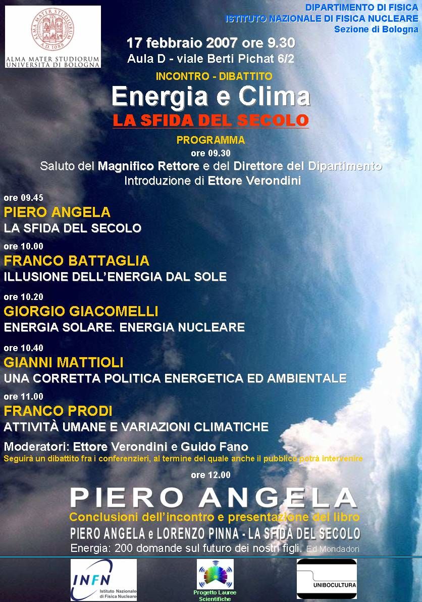 Anno dopo anno, mese dopo mese, la questione dei cambiamenti climatici e il problema delle risorse energetiche, sono le tematiche che sembrano destinate ad occupare, a ragione, uno spazio sempre più ampio nel dibattito pubblico, nonché un'importanza sempre maggiore per il futuro comune del Pianeta. I numerosi allarmi lanciati dalle più note agenzie climatiche e non ultimo il preoccupante rapporto dell'ONU reso pubblico lo scorso gennaio, contribuiscono a rendere un titolo come "Energia e Clima. La sfida del secolo", ben poco presuontuoso o altisonante e invece assolutamente reale e concreto. "Energia e Clima. La sfida del secolo" è infatti il titolo dell'incontro-dibattito previsto per sabato 17 febbraio, che si terrà a partire dalle ore 9,30 presso l'Aula D del Dipartimento di Fisica (Viale Berti Pichat, 6/2). Il programma dell'evento, che potrà essere seguito anche via web streaming da una pagina dedicata, vedrà la presenza di illustri personaggi del mondo della scienza e della fisica tra cui anche il noto giornalista e autore televisivo, scrittore e divulgatore Piero Angela. E sarà proprio Piero Angela ad aprire l'incontro con l'intervento "La sfida del secolo". Seguirà Franco Battaglia, docente di Chimica Fisica presso l'Università di Modena, il cui intervento avrà per titolo "Illusione dell'energia del sole". "Energia solare. Energia Nucleare" sarà invece l'argomento di cui si occuperà Giorgio Giacomelli, docente di Fisica presso l'Università di Bologna. In seguito, Gianni Mattioli, docente di Fisica Matematica presso l'Università di Roma illustrerà il tema "Una corretta politica ambientale". Ultimo intervento previsto sarà quello di Franco Prodi, docente di Fisica dell'Atmosfera presso l'Università di Ferrara: "Attività umane e variazioni climatiche". A conclusione dell'incontro sarà presentato il libro di Piero Angela e Lorenzo Pinna "La sfida del secolo. Energia: 200 domande sul futuro dei nostri figli".