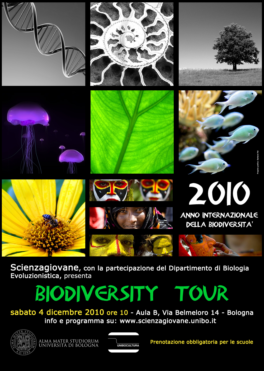 Sabato 4 dicembre, alle 10, nell'Aula B del Comlesso di via Belmeloro (via Belmeloro, 14), si terrà il "Biodiversity Tour", promosso da Scienzagiovane con la collaborazione del Dipartimento di Biologia evoluzionistica sperimentale. Un viaggio immaginario nel mondo delle varietà biologiche per celebrare l'anno internazionale della Biodiversità. Interverranno Roberto Barbieri, Giovanni Cristofolini, Barbara Mantovani, Davide Pettener e Francesco Zaccanti.