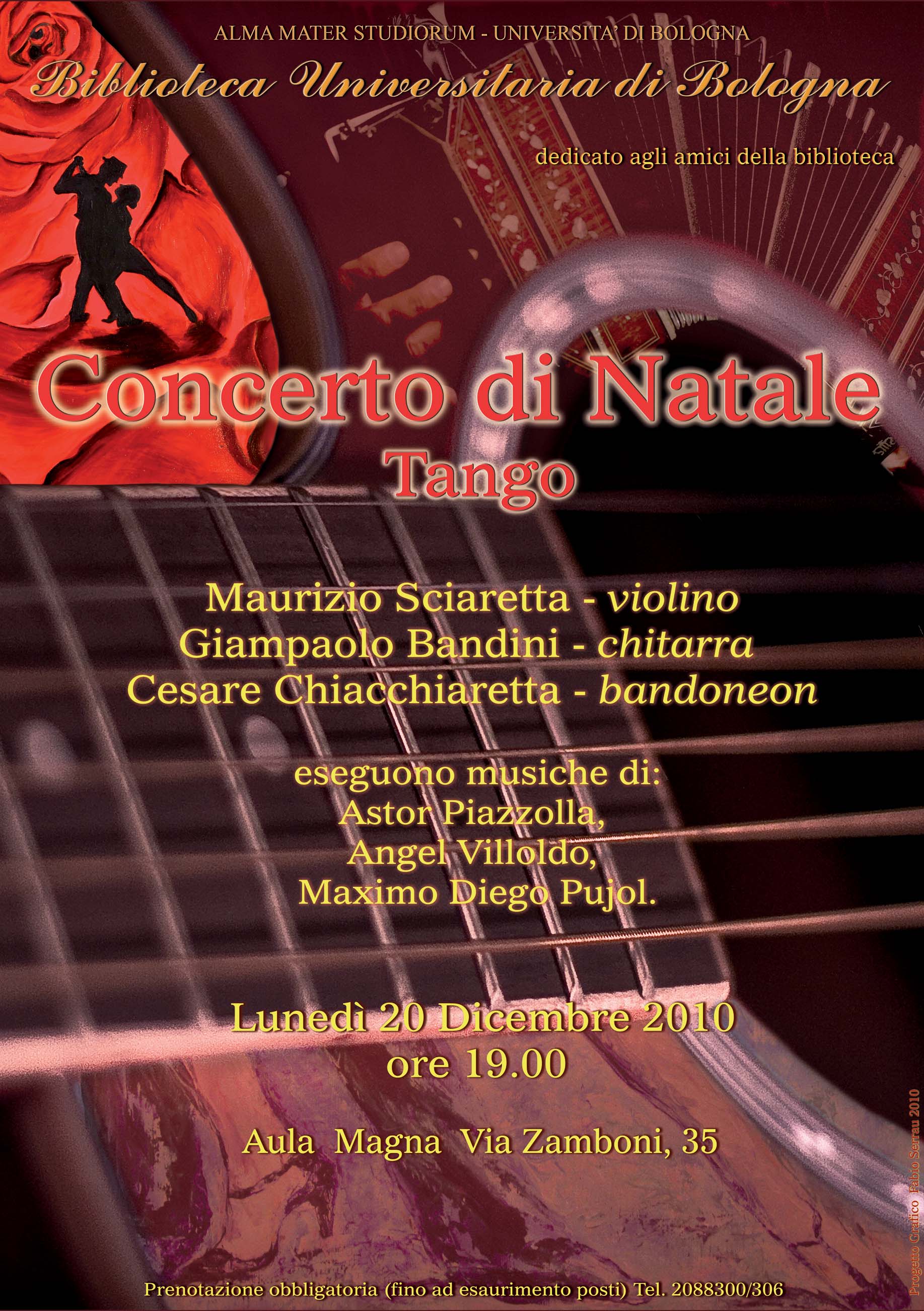 Lunedì 20 dicembre, alle 19, nell'Aula Magna della Biblioteca Universitaria (via Zamboni, 35), si terrà il tradizionale concerto di Natale della Bub. Sotto il titolo "Nubes de Buenos Aires" il programma sarà dedicato al tango e alle musiche argentine. Protagonisti saranno il duo Giampaolo Bandini e Cesare Chiacchiaretta, alla chitarra e al bandoneon, e Maurizio Sciarretta al violino. In programma musiche di Astor Piazzola, Angel Villoldo e Maximo Diego Pujol. Come di consueto, prima del concerto la direttrice della Biblioteca Biancastella Antonino esporrà un sintetico bilancio delle attività svolte nel 2010 e informerà sui programmi e gli obiettivi 2011. Per partecipare (ingresso libero fino ad esaurimento posti) è necessaria la prenotazione, telefonando allo 051-2088300/306.