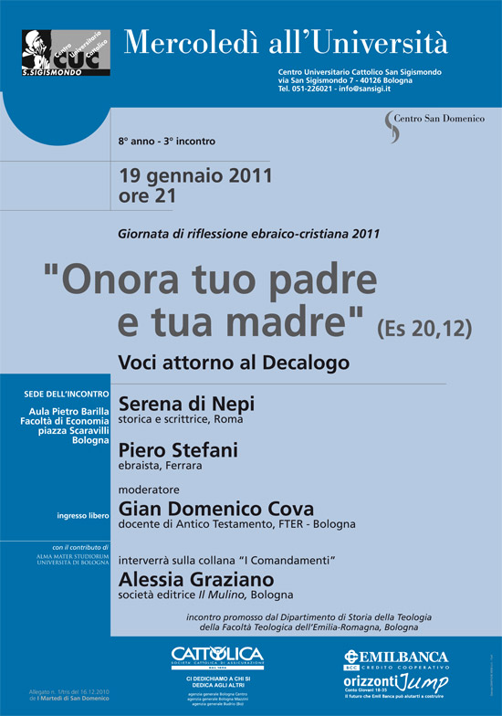 Mercoledì 19 gennaio, alle 21, presso l'Aula Barilla della Facoltà di Economia (piazza Scaravilli, 2), si terrà la terza conferenza dell'anno accademico 2010-11 del ciclo i "Mercoledì all'Università". Tema dell'incontro sarà "'Onora tuo padre e tua madre' (Es 20,12). Voci attorno al Decalogo". Relatori saranno Serena di Nepi, storica e scrittrice e l'ebraista Piero Stefani. Modera Gian Domenico Cova, docente di Antico Testamento (Fter - Bologna). Inoltre Alessia Graziano interverrà sulla collana "I Comandamenti" della società editrice Il Mulino. L'incontro è promosso dal Dipartimento di Storia della Teologia della Facoltà Teologica dell'Emilia Romagna.