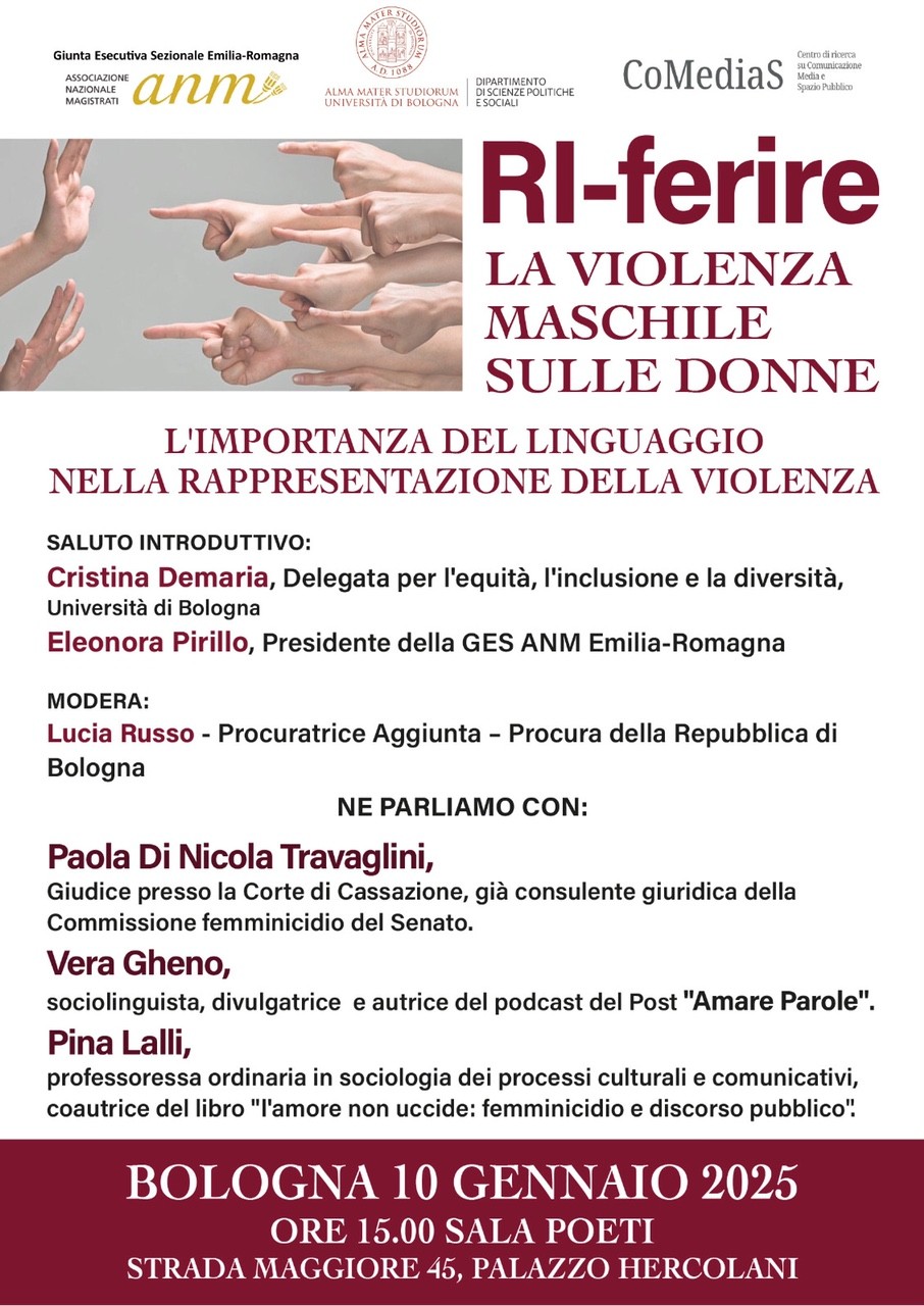 Seminario interdisciplinare in collaborazione con l'Associazione Nazionale Magistrati- sezione Emilia-Romagna, per riflettere sulle varie forme di rappresentazione della violenza di genere nel discorso pubblico.