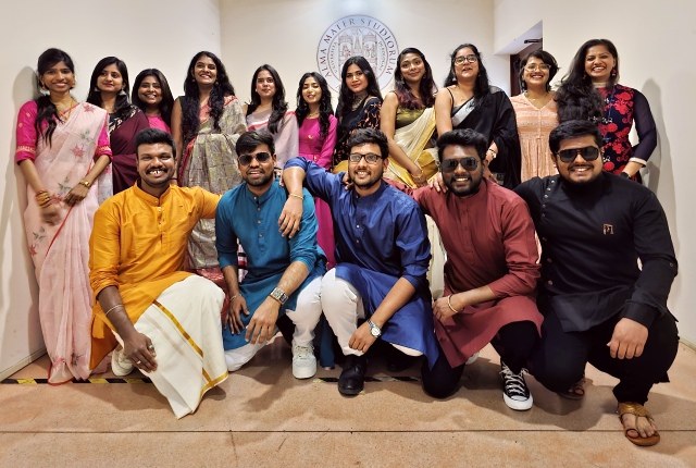 Next, there was a presentation on traditional clothing led by Student Ambassador Aiswarya Varadarajan Nair, followed by a presentation on Indian cinema by Student Ambassador Nitish Kumar. The event also featured several interactive workshops: a Blind Spice Tour on led by Student Ambassador Amirdhavarshini Padmanabhan, a Tamil Writing activity led by Student Ambassador Kavya Thaniyarasu, and a showcase of the art of Indian rangoli by Student Ambassador Shubhra. There was also the opportunity to taste a traditional Kashmiri tea thanks to Student Ambassador Farhaan Zaidi Bhat.