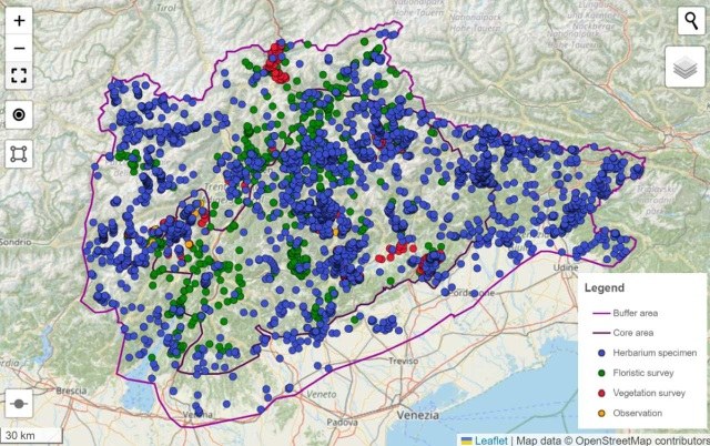 Distribution map of lichen occurrences in the study area. The dark purple line indicates the core area, where data collection was concentrated. It includes all the Italian Dolomites, in addition to the 9 UNESCO sites, and the Lower Dolomites, in the Venetian Pre-Alps. In violet, the surrounding buffer area, for which data was collected if present in the sources consulted, in view of a future project: the inventory of lichens in the Italian Eastern Alps