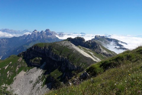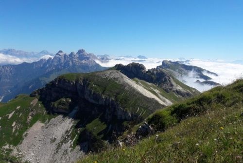 A glimpse of the landscape in the Dolomiti Bellunesi National Park with a view of the Vette Feltrine chain and the Cimonega peaks in the background. An area rich in biodiversity and of considerable biogeographical interest that is home to many interesting lichen species