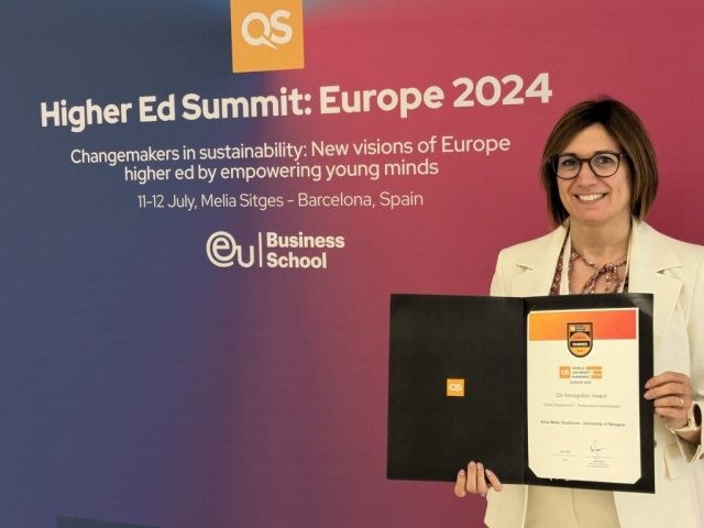 The QS Higher Ed Summit Europe 2024 took place this morning in Barcelona to honour universities that have shown the most significant improvements across all indicators compared to the previous edition of the QS World University Rankings – Europe, which was announced yesterday. The University of Bologna's impressive leap of 30 places earned it the Global Engagement - Performance Improvement Award from the QS network. Professor Simona Tondelli, Vice Rector of the University of Bologna, accepted the award.