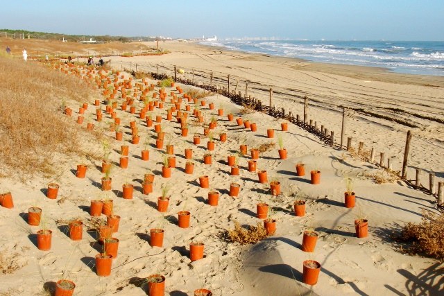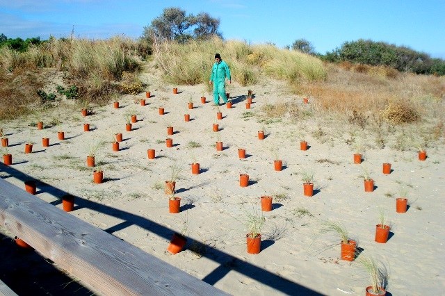 Diventa allora fondamentale salvaguardare questi ambienti tanto importanti e delicati. Il ripetuto calpestio di va in spiaggia, attraversando la duna, o di chi vi sosta per prendere il sole, finisce per danneggiare proprio quelle piante che, con la forza delle loro radici, tengono insieme la sabbia accumulata, impedendo alle dune di franare o di essere progressivamente erose dal vento. Per questo, già dallo scorso anno nel tratto di spiaggia tra Punta Marina e Marina di Ravenna sono state costruite, con finanziamento di ENI, alcune passerelle sopraelevate che permettono di percorrere e ammirare l’area senza comprometterne l’integrità. Il passo successivo, ora, era recuperare le zone danneggiate con la sistemazione di nuove piante.