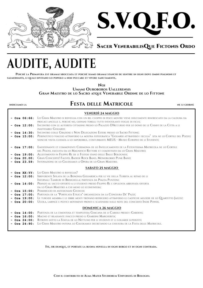 Un programma ricco di iniziative, tra cui alle 17 del venerdì il tradizionale imberrettamento delle Matricole da parte del Rettore Giovanni Molari, coadiuvato dal Gran Maestro, nel Cortile del Pozzo di Palazzo Poggi (via Zamboni, 33). La sera, alle 20, i giardini di Via Filippo Re ospiteranno il concerto di tre band musicali, circondati da stand enogastronomici predisposti dalle Balle bolognesi.