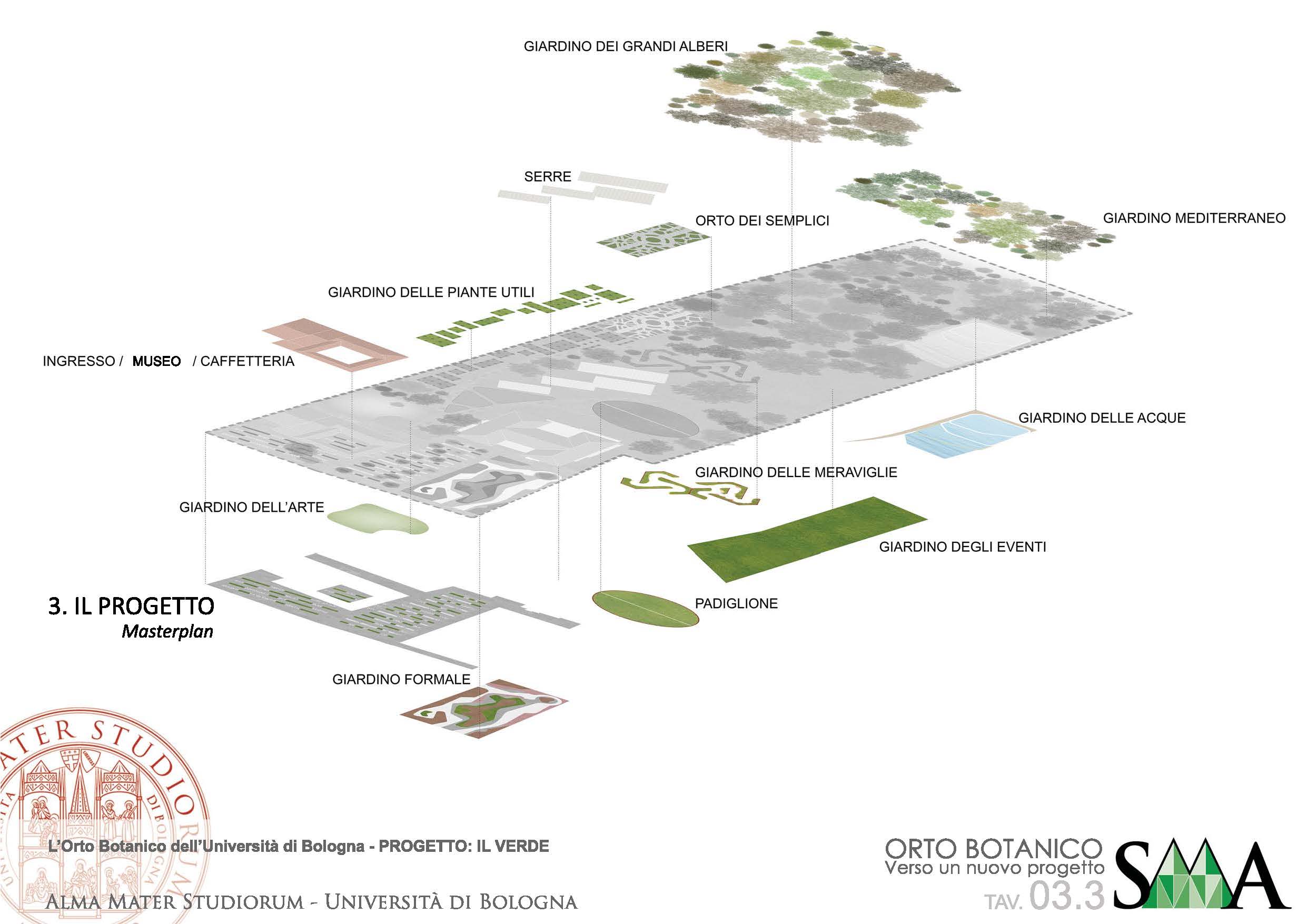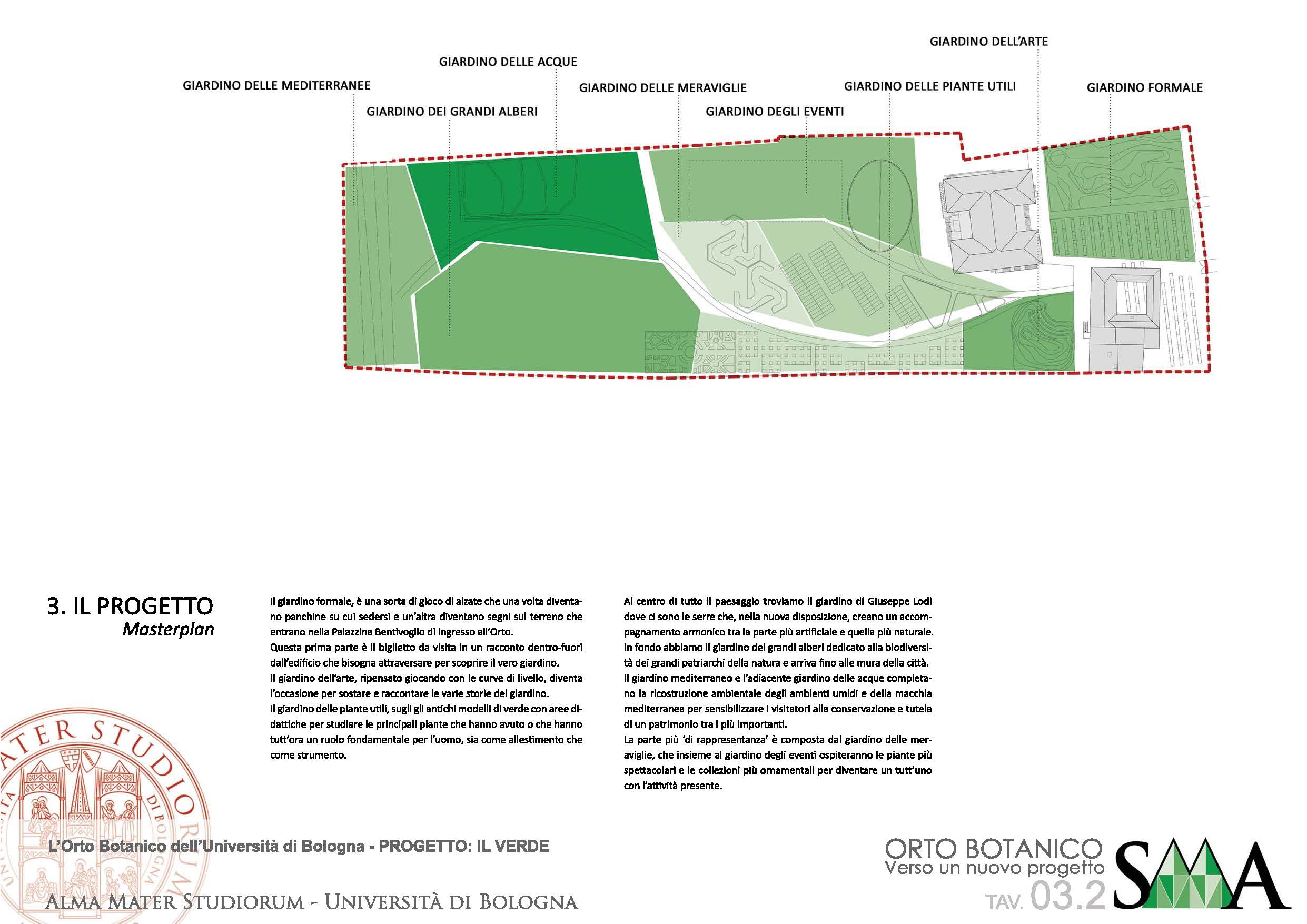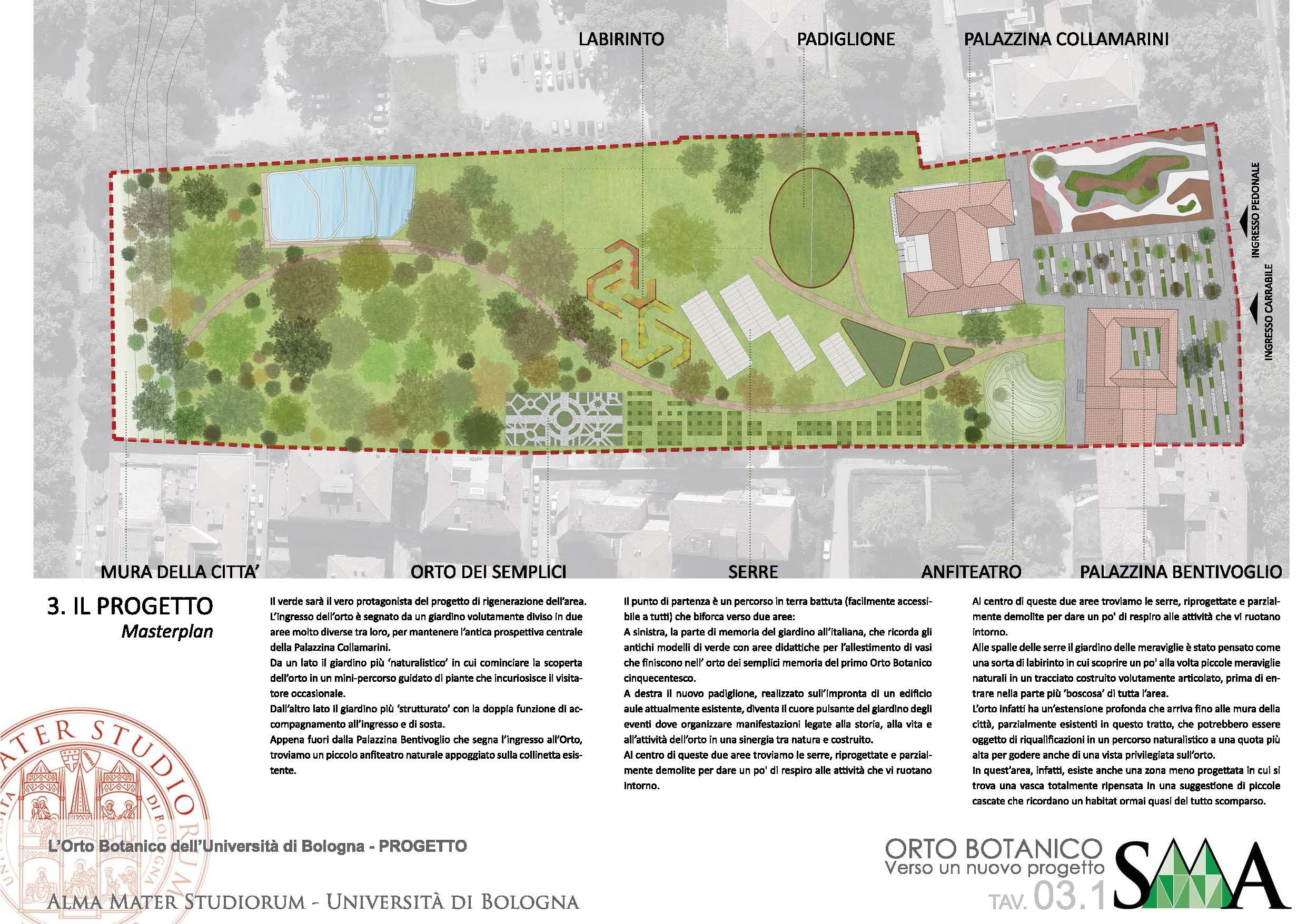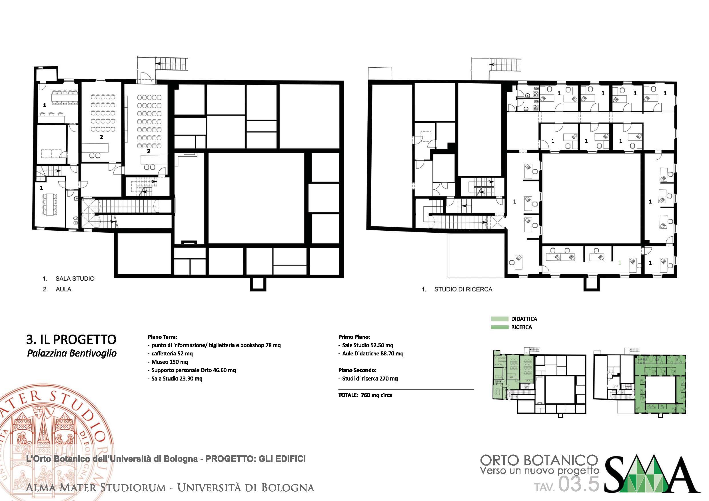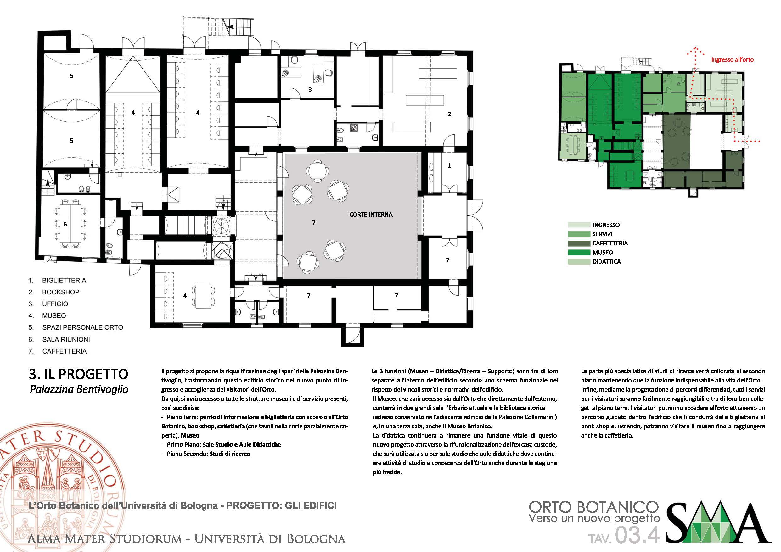 L’idea alla base del progetto è quella di individuare alcuni importanti temi e riorganizzare attorno ad essi le collezioni. Le funzioni di supporto all’Orto verranno realizzate all’interno della rinascimentale Casa Non Grande dei Bentivoglio (detta Palazzina Bentivoglio), mediante un nuovo progetto di rifunzionalizzazione in cui saranno inseriti spazi espositivi per gli erbari storici, oltre a quelli di ingresso, caffetteria e bookshop.