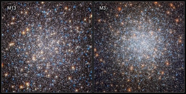 Gli ammassi globulari gemelli M3 (a sinistra) e M13 (a destra) visti dal telescopio spaziale Hubble (HST) (Immagine: ESA/Hubble & NASA, G. Piotto et al.)