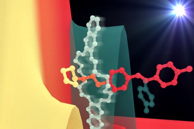 Il motore molecolare è costituito da due componenti a forma di anello e di filo. Sfruttando i metodi della chimica supramolecolare, i ricercatori hanno fatto in modo che il filo e l’anello si infilassero l’uno nell’altro in modo veloce ed efficiente: un risultato già di per sé stupefacente, dato che l’anello ha un diametro di soli 0,7 nanometri. Inoltre, tale movimento avviene secondo una direzione precisa: l’anello scorre sul filo soltanto attraverso il componente detto azobenzene (in verde nella figura). L’arrivo di un fotone di luce provoca un profondo cambiamento strutturale nell’azobenzene: la nuova forma (in rosso nella figura) non soltanto blocca il movimento dell’anello in senso contrario, ma lo spinge fino a farlo uscire dall’altra estremità del filo. Un altro fotone di luce rigenera la forma iniziale dell’azobenzene (in verde), mettendo il sistema in condizioni di ripetere il ciclo. Nel complesso, per azione della luce, le molecole ad anello vengono sospinte in modo ripetitivo lungo il filo molecolare in una precisa direzione per una distanza di circa 1,7 nanometri. Nelle condizioni utilizzate negli esperimenti, a temperatura ambiente in un volume di 1 millilitro, il sistema pompa all’incirca 20 miliardi di anelli molecolari al secondo.