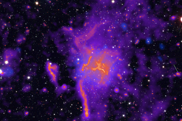 Immagine composita dell'ammasso di galassie Abell 2255. In blu i dati a raggi X rilevati dal satellite ROSAT; in arancione e viola i dati radio di LOFAR. Il bagliore viola è l'emissione radio che circonda l'intero ammasso di galassie. L'immagine mostra uno spazio di circa 18 milioni di anni luce (Immagine: ROSAT/LOFAR/SDSS/Botteon et al.; immagine composita: Frits Sweijen)