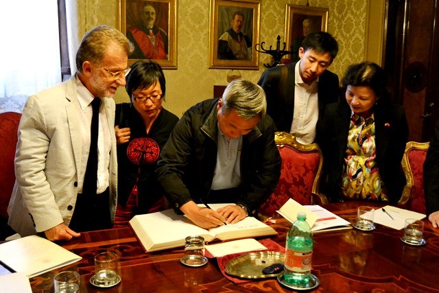 Ad accogliere la delegazione c'erano il rettore dell'Alma Mater Ivano Dionigi, il prorettore per le relazioni internazionali Carla Salvaterra e la co-direttrice dell'Istituto Confucio presso l'Università di Bologna Marina Timoteo.