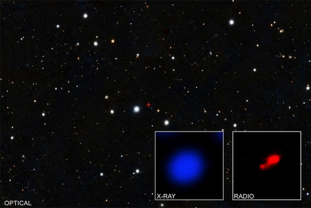 L'immagine riporta la rilevazione ottica effettuata con il telescopio Pan-STARRS. Nel riquadro a sinistra i raggi X rilevati con il Chandra X-ray Observatory da una piccola regione centrale (contrassegnata dalla croce rossa) del campo ottico. Nel riquadro a destra, lo stesso campo visivo visto dal radiointerferometro ALMA: la fonte luminosa è il quasar, mentre in basso a sinistra emerge una galassia vicina. (Immagine: X-ray - NASA/CXO/Pontificia Universidad Catolica de Chile/F. Vito; Radio - ALMA (ESO/NAOJ/NRAO); Optical - PanSTARRS)