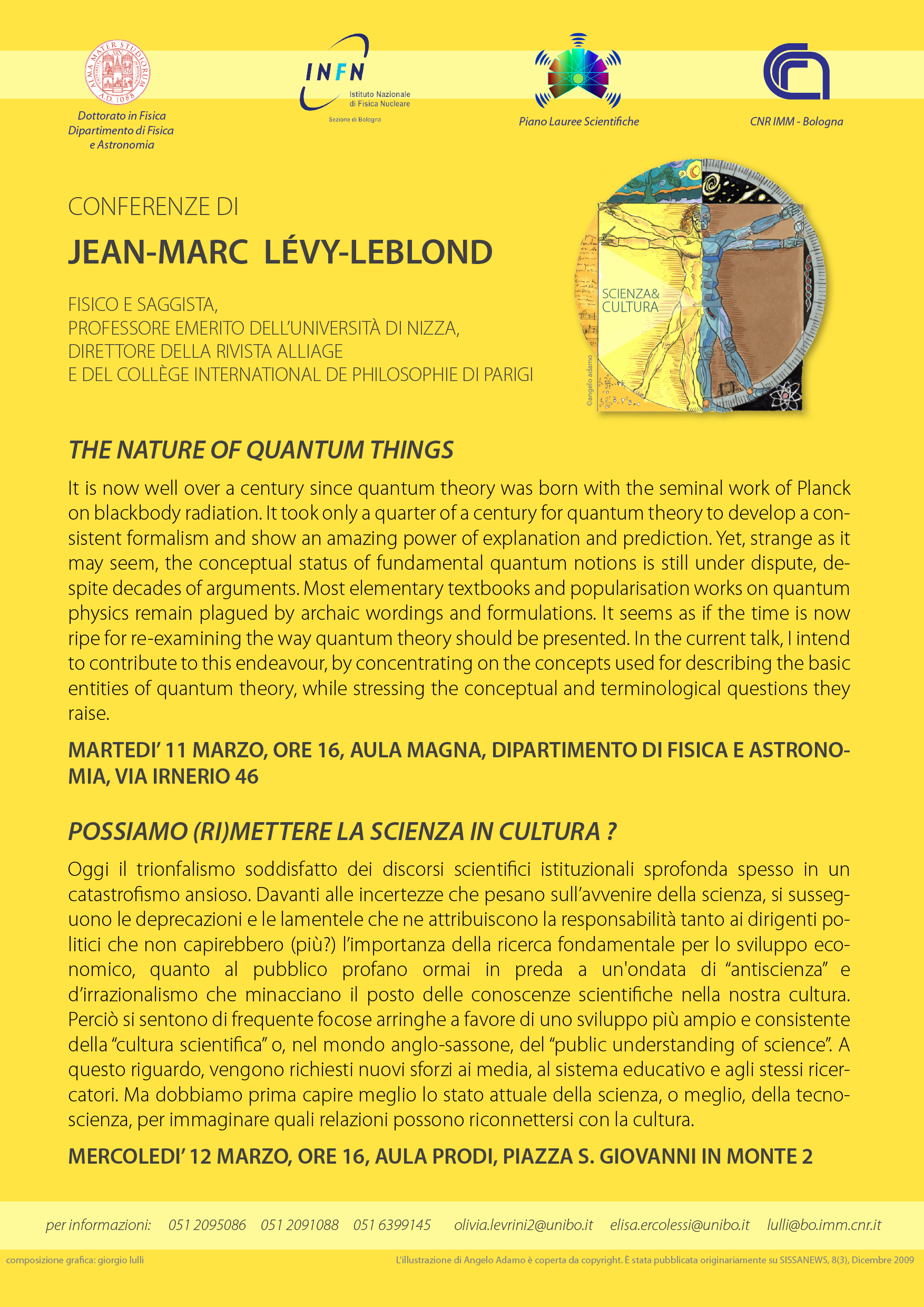 Domani, martedì 11, e mercoledì 12 marzo il Dipartimento di Fisica e Astronomia dell'Università di Bologna organizza una due giorni di seminari tenuta da Jean-Marc Lévy-Leblond, noto fisico e saggista francese, nonché professore emerito presso l’Università di Nizza e direttore della rivista "Alliange" e del Collège International de Philosophe di Parigi. I temi che lo studioso affronterà in ognuna delle due giornate saranno rispettivamente "The nature of Quantum Things" e "Possiamo (ri)mettere la scienza in cultura?".