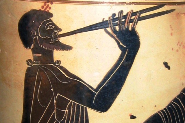 Diffuso in tutto il mondo greco e magnogreco, l’aulos era uno tra gli strumenti più usati anche perché richiedeva una relativa abilità tecnica ed era suonato anche da musicisti non professionisti, che potevano trasportarlo agevolmente. Considerato un insostituibile elemento del rito, lo strumento a fiato evocava la festività stessa e la sua sonorità era indispensabile per dare vitalità alla cerimonia. Sin dalla sua prima comparsa, che si fa risalire all’VIII secolo a.C., l’aulos era protagonista non soltanto nelle processioni che si dirigevano verso i santuari e nei differenti momenti del rito, ma anche nelle danze eseguite nell’ambito sacro.