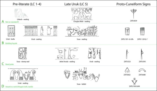 “Siamo partiti concentrandoci sulle immagini nate prima della comparsa della scrittura e ne abbiamo seguito lo sviluppo fino al periodo proto-letterato”, aggiungono Kathrtyn Kelley e Mattia Cartolano, entrambi ricercatori dell’Università di Bologna e coautori dello studio. “In questo modo siamo riusciti a identificare una serie di motivi legati al trasporto di stoffe e vasellame che si sono poi trasformati in segni corrispondenti del proto-cuneiforme”.