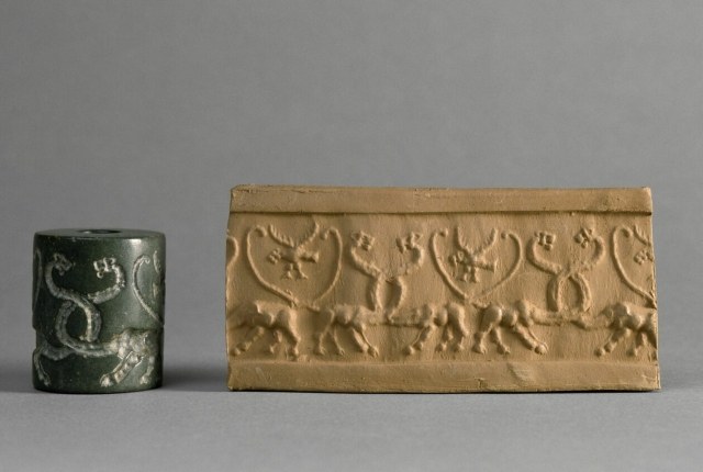 È in quest’area che nacquero i sigilli cilindrici. Realizzati di norma in pietra e incisi con una serie di disegni, questi cilindri venivano fatti rotolare su tavolette d’argilla, che restavano così stampate con il motivo disegnato.