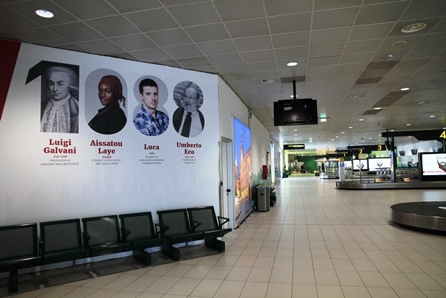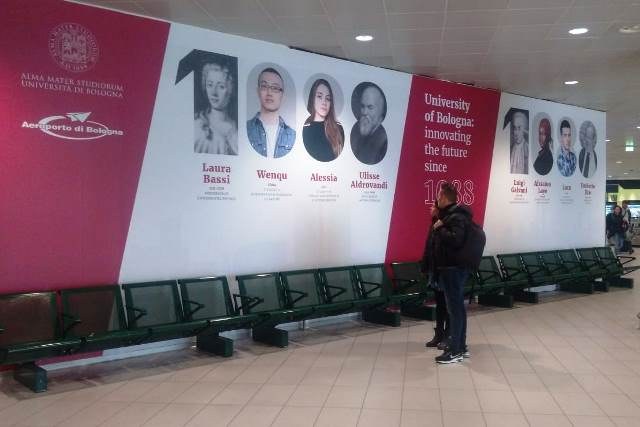 I sempre più numerosi passeggeri in arrivo all'Aeroporto Guglielmo Marconi vengono, così, accolti da un messaggio di benvenuto nella città in cui è nata la prima università del mondo occidentale, attraverso i volti di chi l'ha animata nel corso dei secoli e di chi la vive ancora oggi.