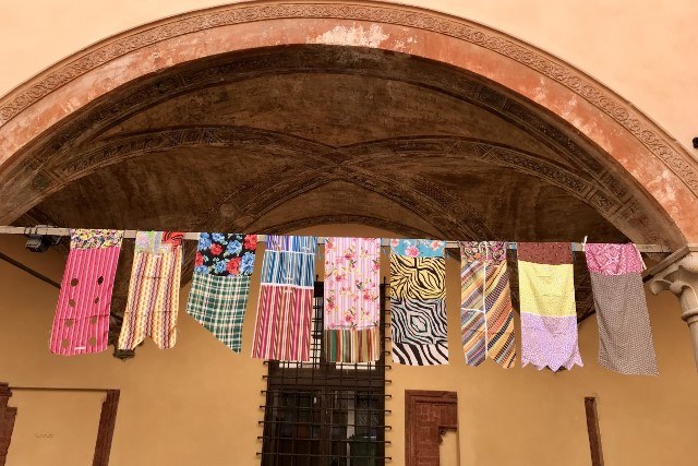 Questi drappi colorati escono da un carcere. A cucire gli scampoli che li formano è stata la sartoria “Gomito a gomito”, che opera nel braccio femminile della casa circondariale della Dozza.