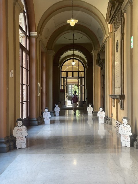 Da oggi, durante l’ennesima attesa della prossima udienza, fissata per il 27 settembre, trenta immagini di Patrick e centoventi drappi colorati popolano e colorano i corridoi e il cortile di Palazzo Poggi, sede del Rettorato, centro dell’Alma Mater.
