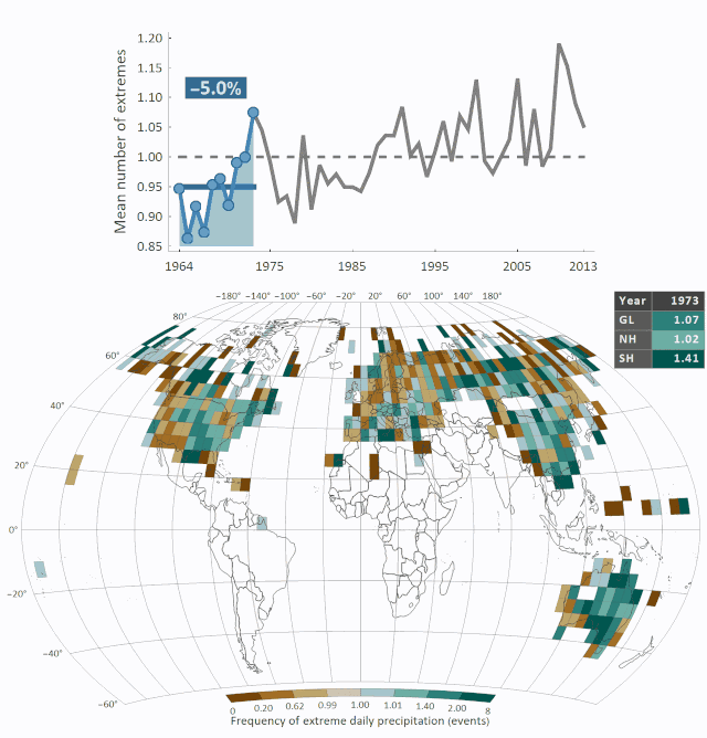 Un trend di costate crescita che secondo gli studiosi può essere messo in relazione con il riscaldamento globale causato negli stessi decenni dall'attività dell’uomo. Temperature più alte portano infatti ad un maggiore accumulo di acqua nell'atmosfera e di conseguenza ad una più alta frequenza di forti precipitazioni.