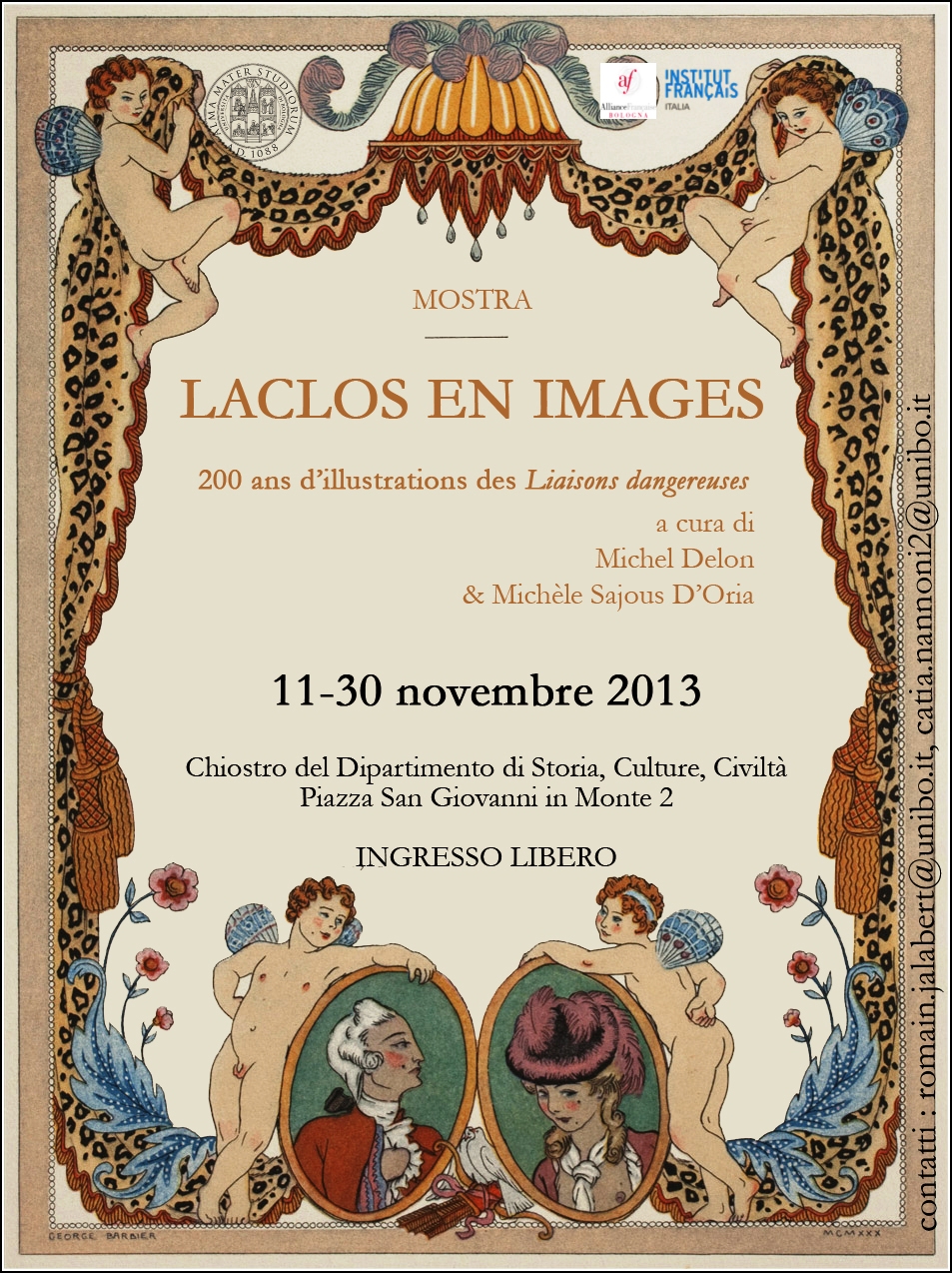 Fino a sabato 30 novembre, nel chiostro del Complesso di San Giovanni in Monte, sede del Dipartimento di Storia, culture, civiltà, è allestita la mostra "Laclos en Images. 200 ans d'illustrations des 'Liaisons dangereuses'". L'esposizione, a cura di Michel Delon e Michèle Sajous D'Oria, è un viaggio nell'iconografia delle edizioni del romanzo epistolare di Pierre-Ambroise-François Choderlos de Laclos "Le relazioni pericolose".