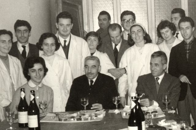 Il prof. R. Selli, seduto accanto al suo predecessore prof. M. Gortani, attorniato da una schiera di giovani assistenti (ultimi anni 1950). Il prof. Mario Ciabatti è il quarto da sinistra in piedi
