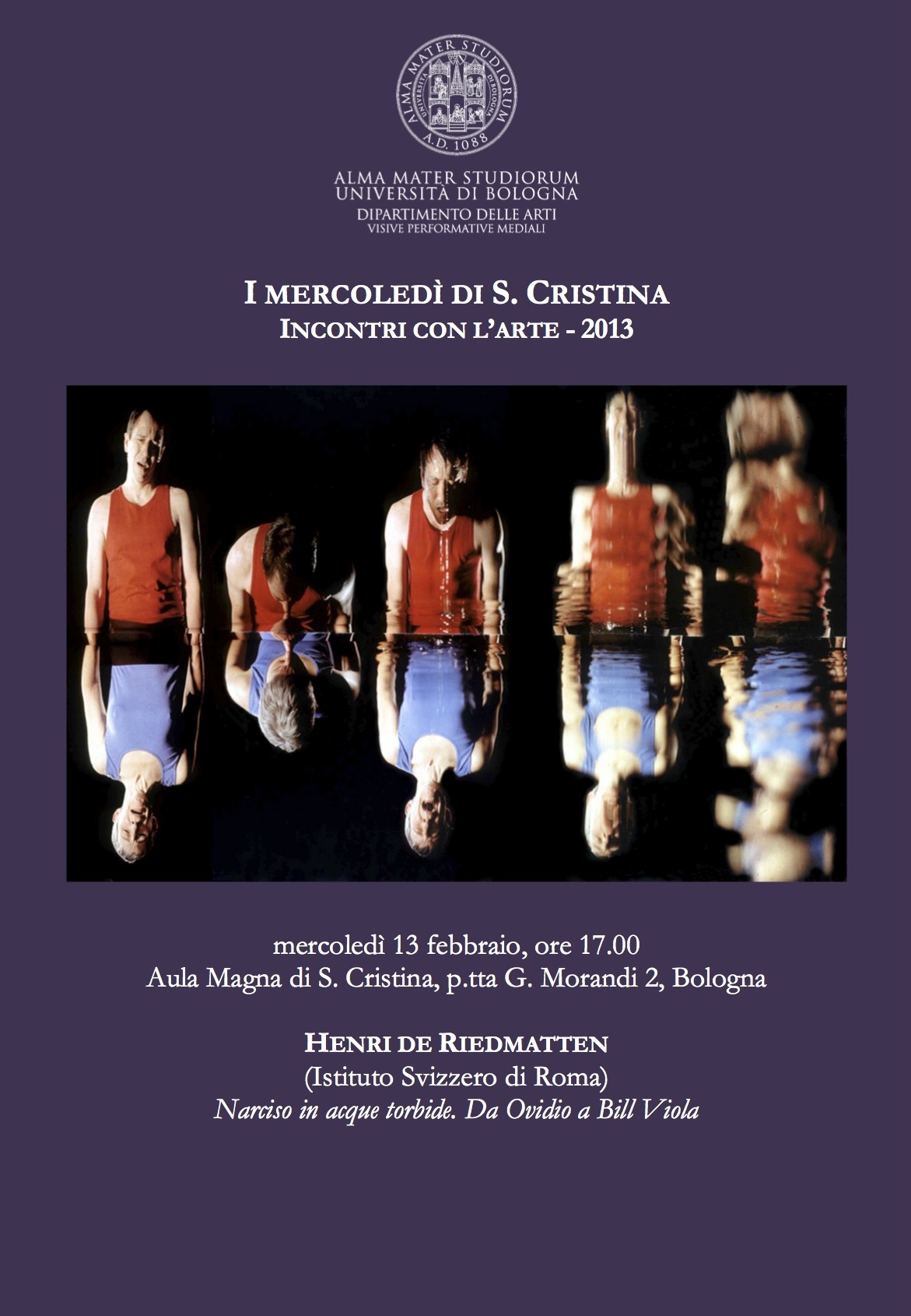 Henri de Riedmatten dell’Istituto Svizzero di Roma tiene una conferenza intitolata "Narciso in acque torbide. Da Ovidio a Bill Viola". Introduce la docente Unibo Lucia Corrain.