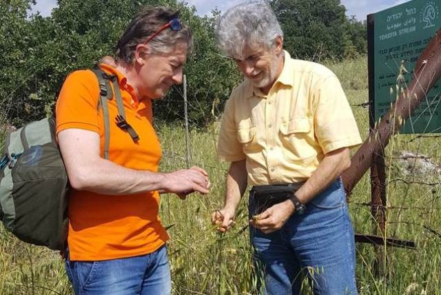 Luigi Cattivelli (CREA, a sinistra) e Roberto Tuberosa (Unibo, a destra) raccolgono spighe di farro selvatico nel parco naturale Zavitan (Israele) da cui, a seguito della domesticazione e selezione, è poi derivato il grano duro moderno sequenziato nello studio