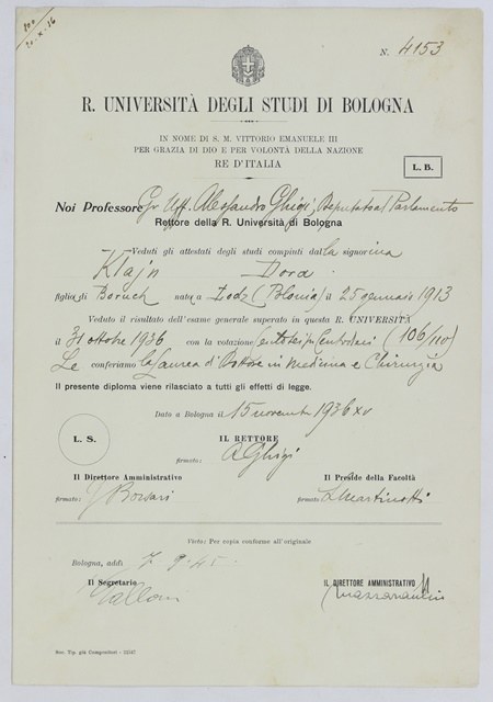Quello fu senza dubbio l’attimo cruciale della mia vita nel lager, perlomeno per il tempo trascorso ad Auschwitz. Con gesto istantaneo tolsi dal vestito ove lo custodivo il mio certificato di laurea sottoponendolo alla verifica delle SS. Questo documento produsse una sorprendente impressione sui due. L’Università di Bologna nota in tutto il mondo, e l’enfatica dicitura: laureata in “Medicina e Chirurgia” fecero il resto. Il caso mio era più unico che raro negli annali dei lager tedeschi …Le confidenze che due si scambiavano a voce bassa, non nascondendo un pizzico di ammirazione per la mia previdente manovra...Fui subito gratificata con il titolo di Ärtzin (dottoressa) che mi lasciò allibita dalla sorpresa” (Dora Klein, Vivere e sopravvivere. Diario 1936-1945, Milano, Mursia, 2001, pp. 167-168.)