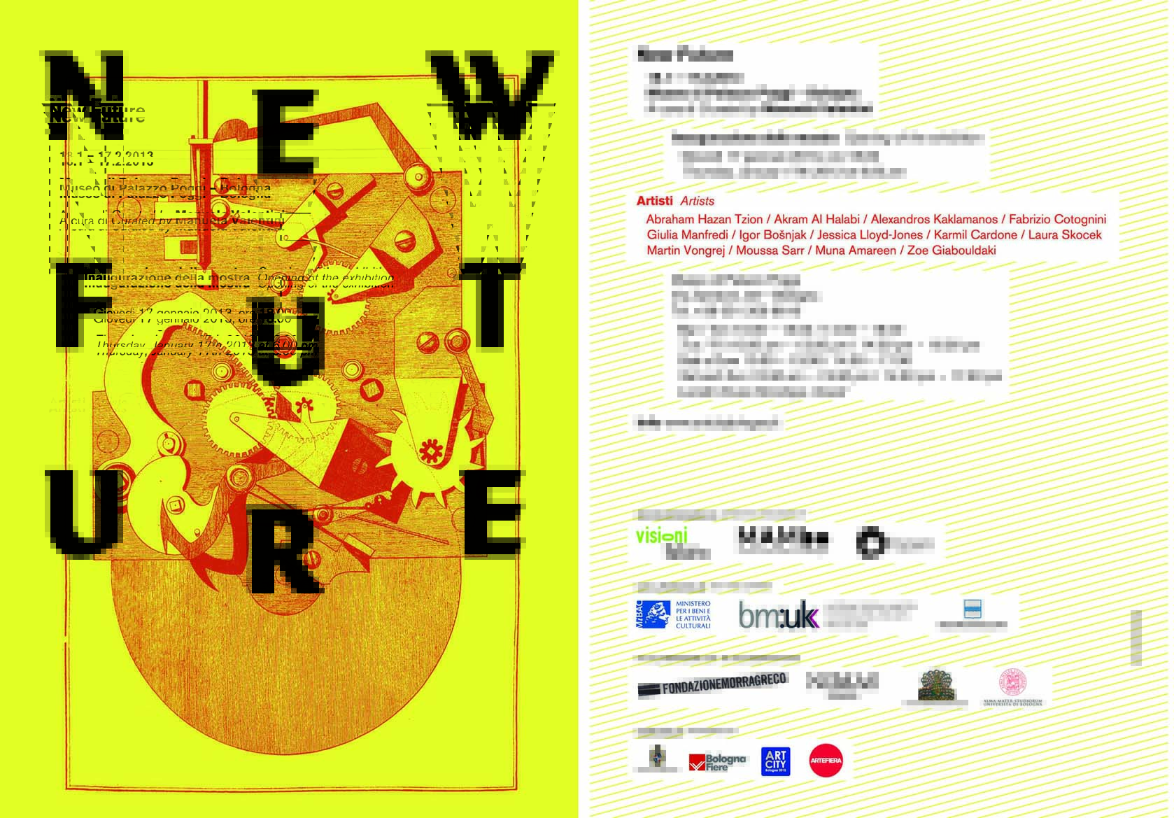 Dal 18 gennaio al 17 febbraio gli spazi del Museo di Palazzo Poggi accolgono tredici interventi site-specific realizzati da giovani artisti nell'ambito della mostra collettiva "New Future" promossa da Visioni Future, MAMbo e dalla Biennale dei giovani artisti dell'Europa e del Mediterraneo (BJCEM).