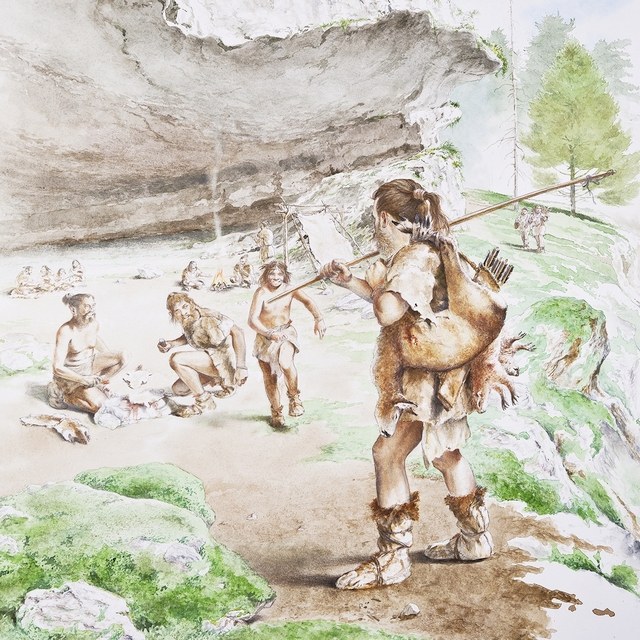Ricostruzione di una scena paleolitica: Disegno di Mauro Cutrona; credit: Comune di Clauzetto (PN)