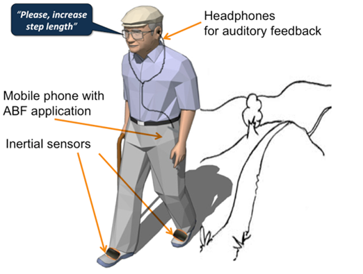 Il sistema è composto da uno smartphone, che funge da unità di elaborazione e generatore audio, e da tre sensori inerziali, in grado di misurare le accelerazioni e rotazioni. I sensori inerziali devono essere collocati sulle scarpe e sul tronco e sono attivati dallo smartphone con un'applicazione user-friendly. I sensori monitorano in tempo reale l'adeguatezza dei passi e della postura del tronco e, nel caso in cui venga misurato uno schema di andatura difettosa, lo smartphone segnala vocalmente al paziente la modifica di una specifica caratteristica (lunghezza del passo, velocità, cadenza) per recuperare un cammino adeguato.