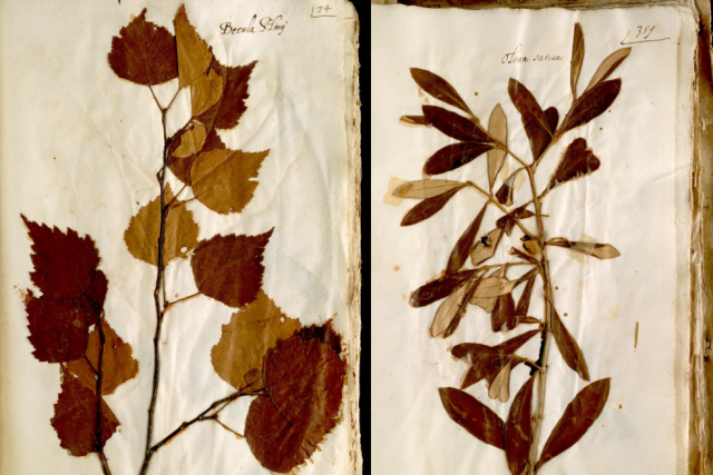 Dall'Erbario di Ulisse Aldrovandi. A sinistra, Betula Plinij (Betula pendula Roth): campione del 1551, raccolto sul Monte Capra (442 m s.l.m.), a sud-ovest di Bologna. Oggi, nel luogo non vi sono più le condizioni ambientali idonee alla sua crescita. A destra, Oliua satiua (Olea europaea L.): campione del 1551, raccolto nell’agro bolognese (il territorio di Bologna). La pianta era molto probabilmente coltivata in un oliveto. (Immagine: Biblioteca Universitaria di Bologna - Università di Bologna)
