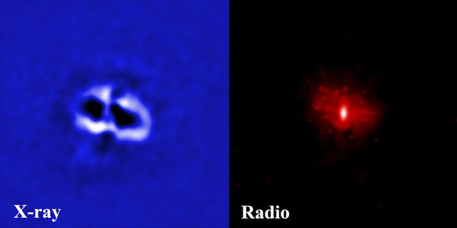 La prima di queste due coppie di cavità, o bolle, nel gas caldo dell’ammasso RBS 797, quella in direzione est-ovest, era già stata individuata da un precedente studio, ma la seconda, quella in direzione nord-sud, è una novità. Per scoprirla, gli studiosi hanno ricostruito un’immagine che utilizza i dati rilevati in quasi cinque giorni di osservazioni del telescopio Chandra. La conferma viene anche da osservazioni realizzate dal radiotelescopio Very Large Array, che hanno individuato emissioni radio sovrapponibili alle enormi cavità presenti in RBS 797.