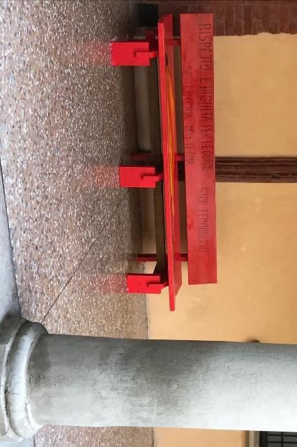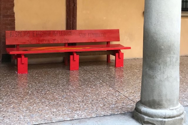 Si tratta quindi di una panchina rosso sangue, simbolicamente occupata dalle numerosissime donne vittime di violenza, volta a veicolarne la memoria e a restituire loro il posto che occupavano al cinema, a scuola, in autobus, prima che un uomo decidesse di porre fine alla loro vita.